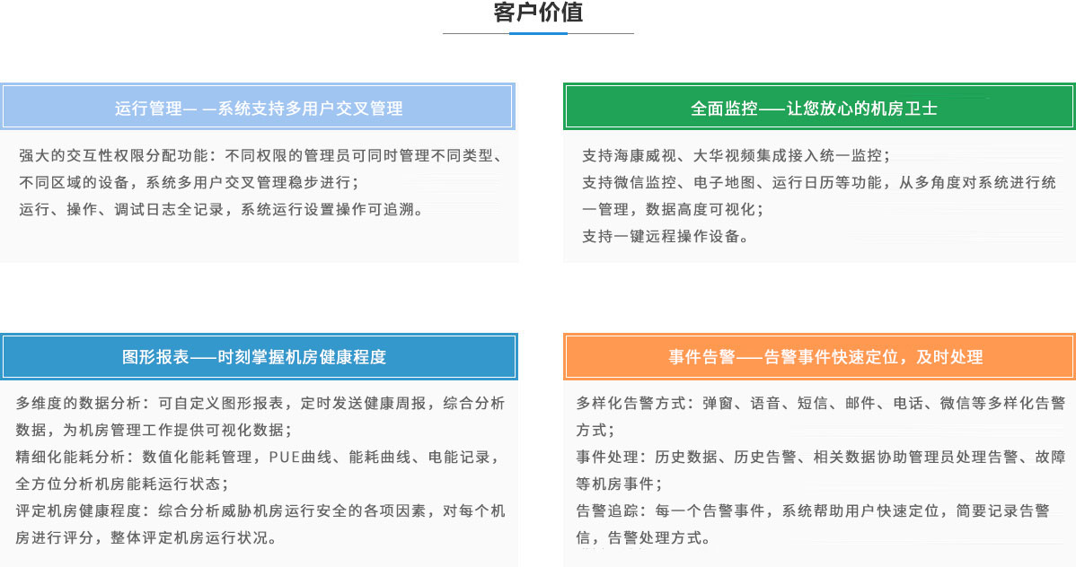 全面監(jiān)控——讓您放心的機(jī)房衛(wèi)士 多樣化告警方式:彈窗、語音、短信、郵件、電話、微信等多 樣化告警方式; 事件處理:歷史數(shù)據(jù)、歷史告警、相關(guān)數(shù)據(jù)協(xié)助管理員處理告 警、故障等機(jī)房事件; 告警追蹤:每一個(gè)告警事件,系統(tǒng)幫助用戶快速定位,簡要記 錄告警信,告警處理方式。 |